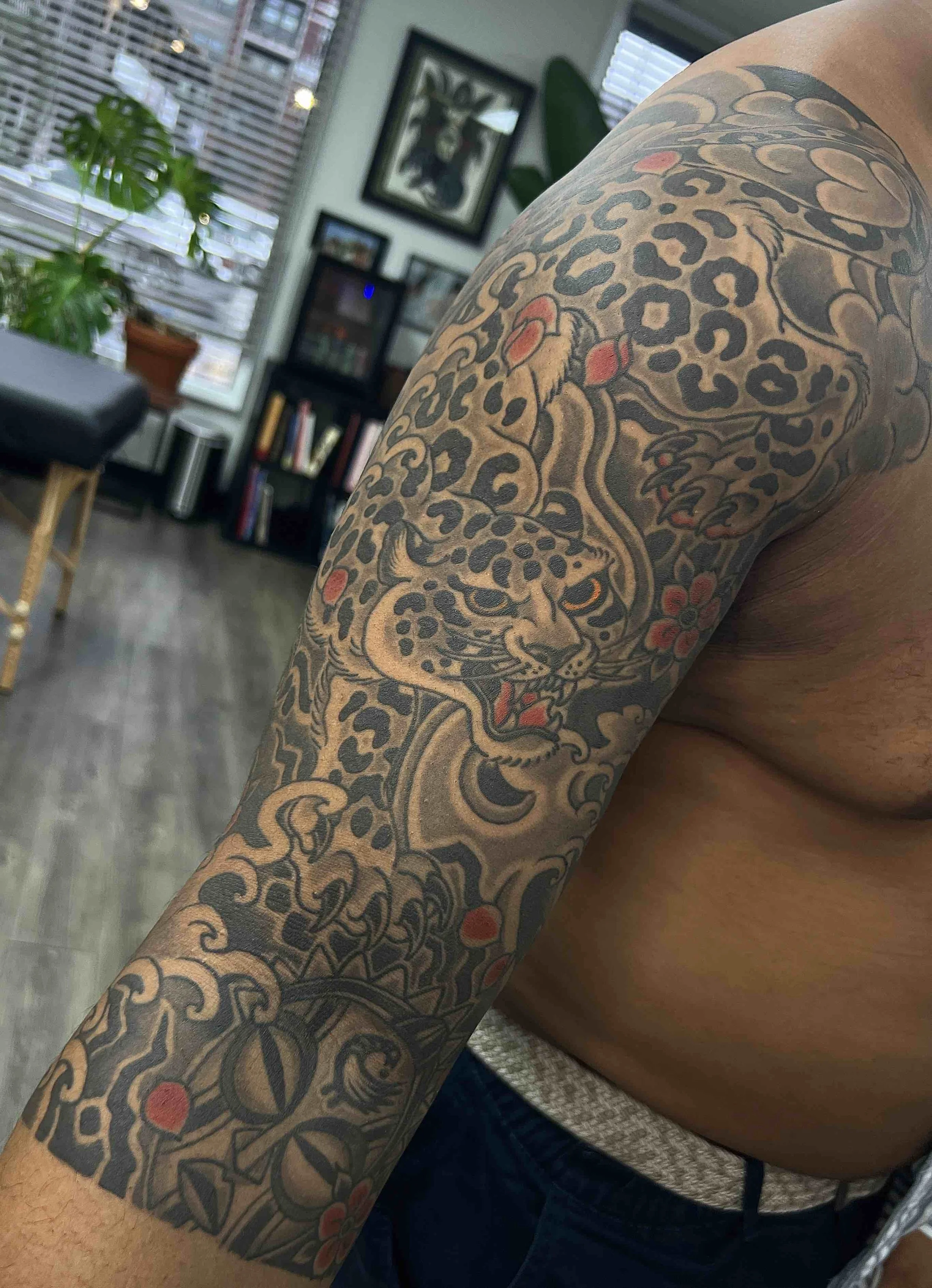 Rather than placing individual images randomly, Wes designs tattoos so that the composition flows with the anatomy of each client. This creates a cohesive design that looks balanced from multiple angles.